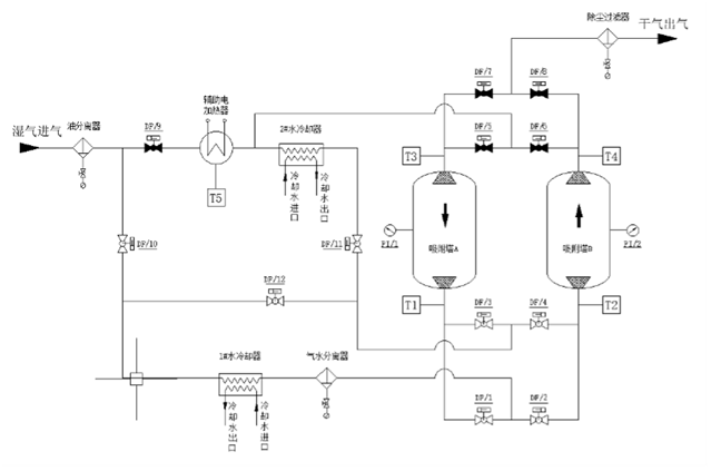 干燥器采用加熱再生閉式循環,全流量冷吹,零排放,加熱再生采用分流工藝,無需鼓風機等動力設備,工藝先進安全節能且露點穩定。